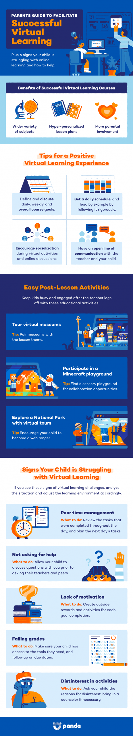 A flexible mindset and positive attitude towards virtual learning will help create a successful transition. Although there will be an adjustment period, and things will likely not go as planned every step of the way, it’s important to keep an open mind and line of communication.