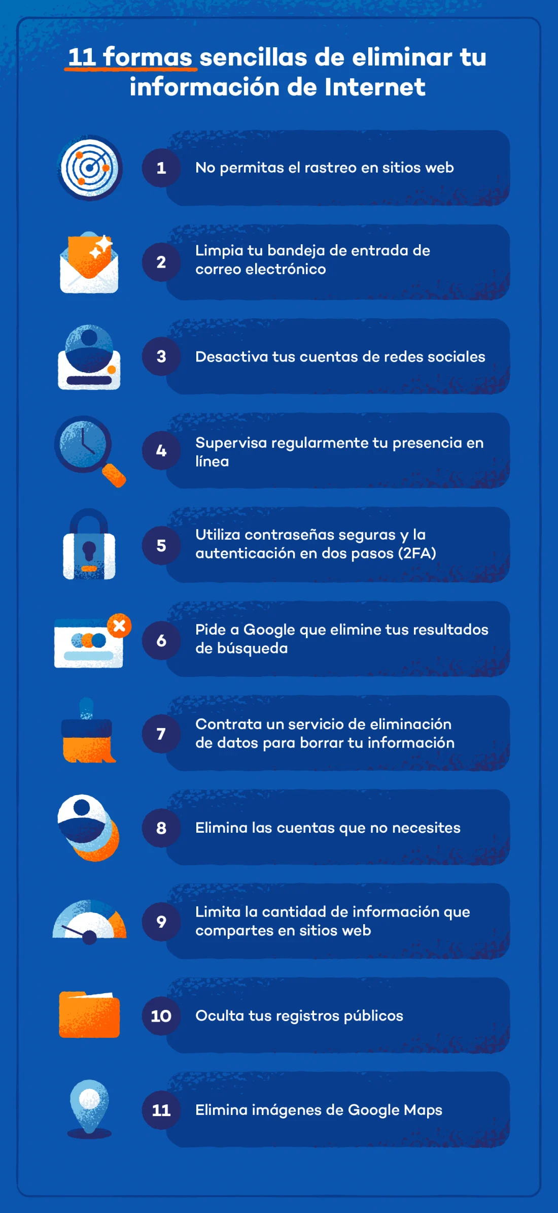 Tomarte un descanso o cerrar tus cuentas en redes sociales elimina una gran cantidad de datos personales públicos. Es una de las formas más eficaces de borrar información personal de Internet. Al hacerlo evitas que tus publicaciones, “me gusta” y actividad puedan usarse para construir un perfil sobre ti, limitando a su vez la posibilidad de que los hackers rastreen tu historial.