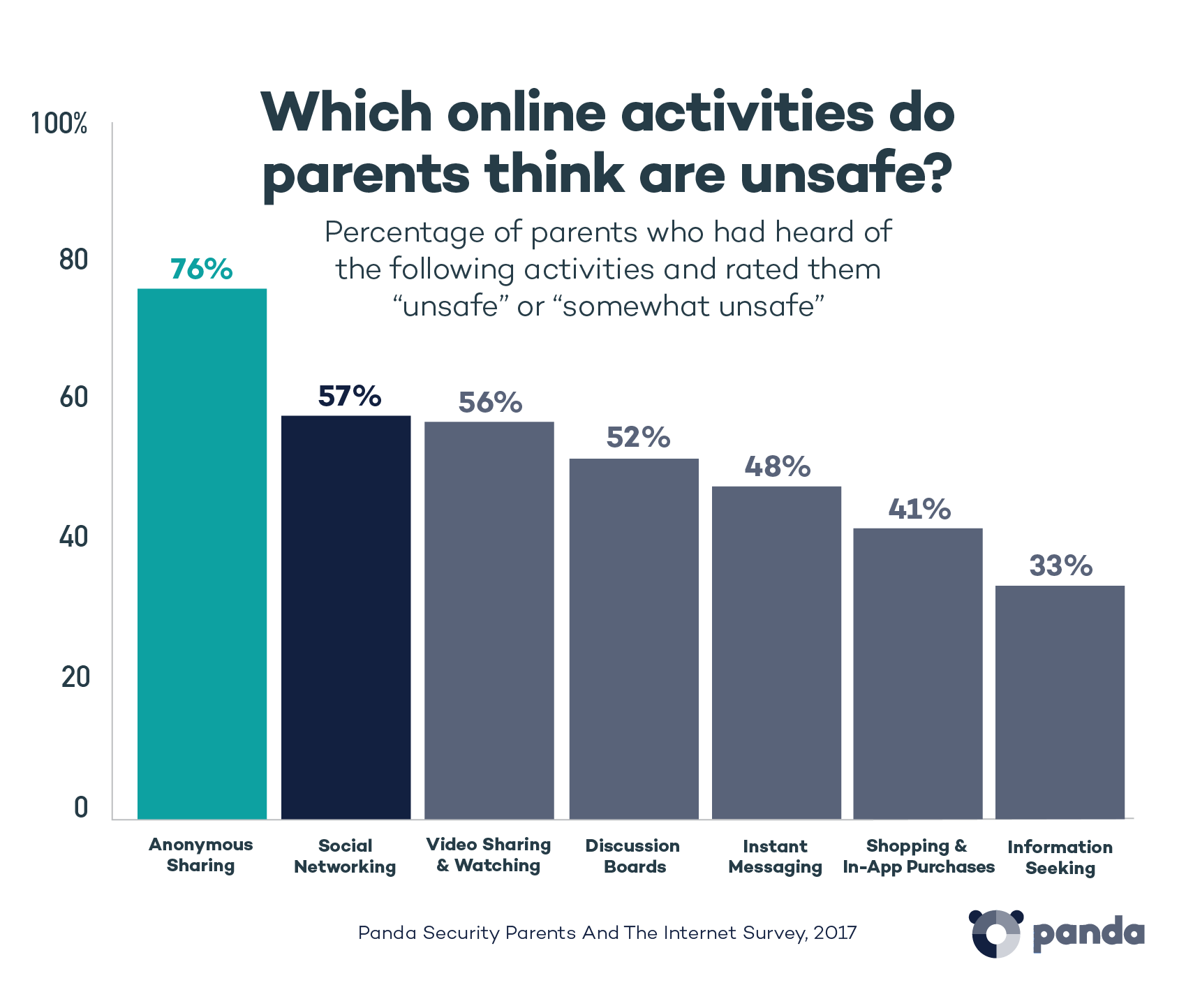 Of the seven online activities we listed, “anonymous sharing” was the online activity most concerning to parents. 75.9 percent reported feeling “somewhat unsafe” or “very unsafe” when it came to their kids and anonymous sharing.