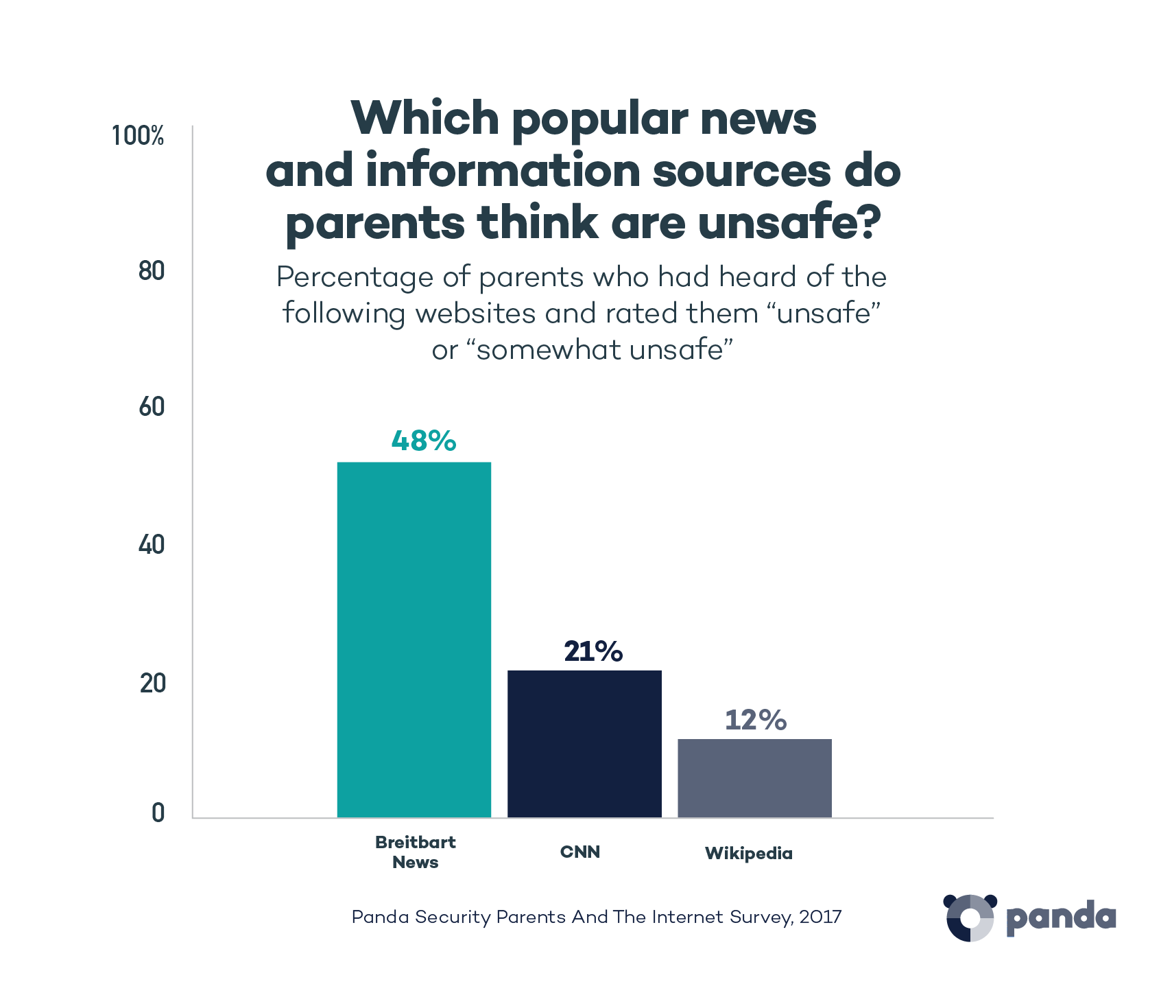 Parents also considered news sites like CNN and Breitbart as a threat to their children. 20.5 percent felt concerned about CNN while 47.9 percent reported Breitbart News as somewhat or very unsafe.