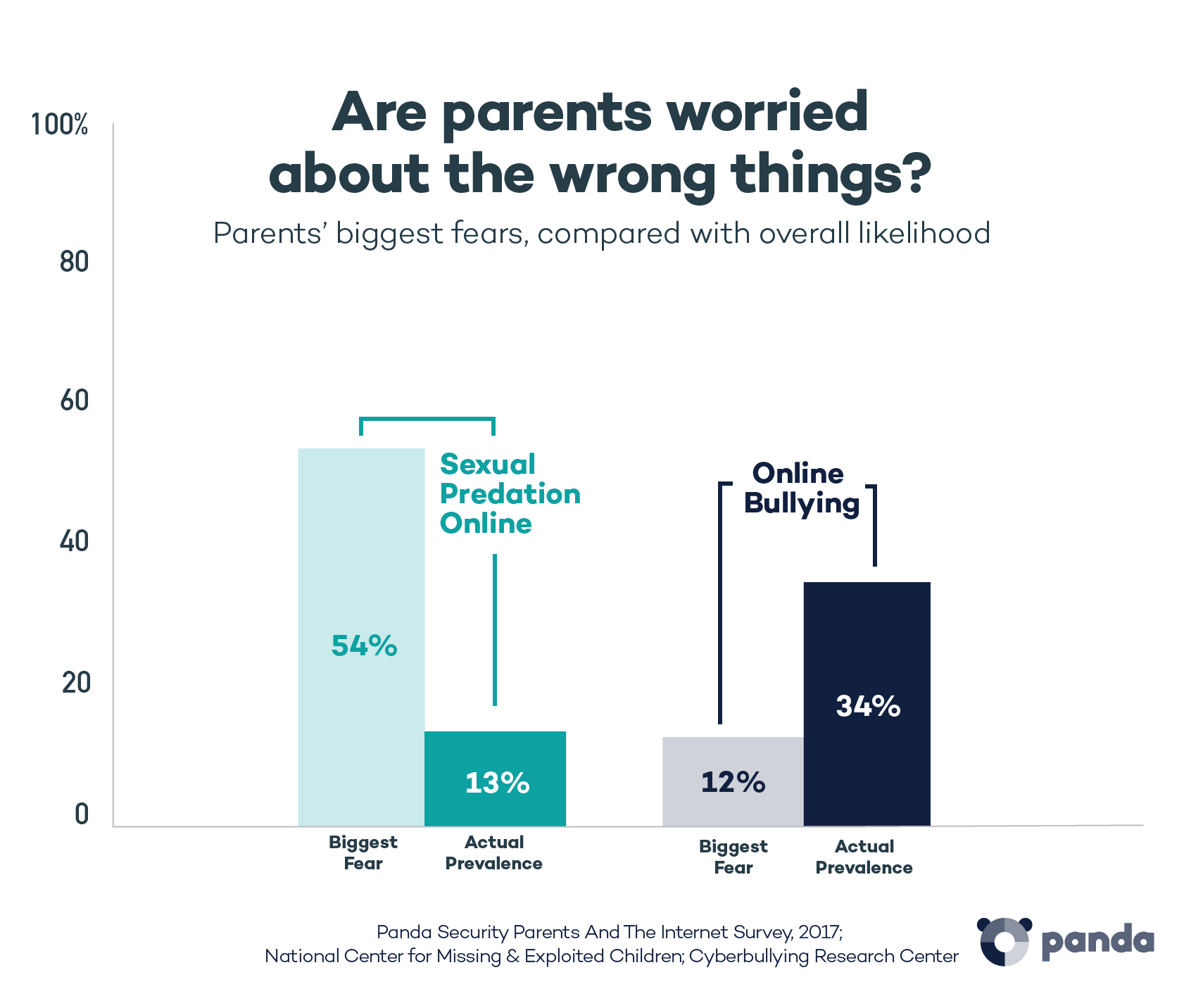 Our analysis shows parents biggest fears aren’t reflective of actual prevalence rates. Of the total group, 54.2 percent of parents said sexual predation online was their biggest concern while 11.8 percent said the same for online bullying. Sexual predation is defined as any person using the internet for the express purpose of targeting a minor to perform non-consensual sex acts.