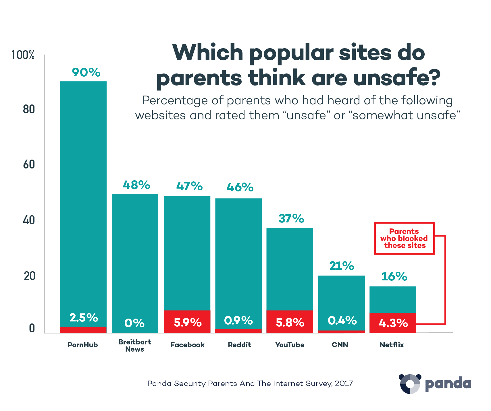 - More parents block Facebook (5.9 percent), YouTube (5.8 percent), Netflix (4.3 percent), than they do Pornhub (2.5 percent).
