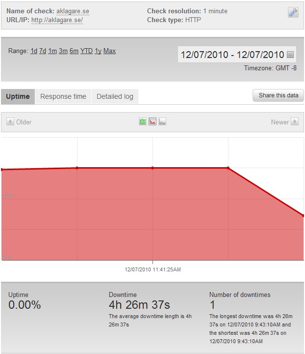 We have recorded 4 hours 26 minutes of downtime for Aklagare.se, since the attack started focusing on the site at 9:44AM PST