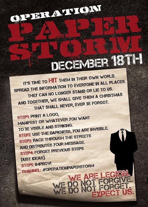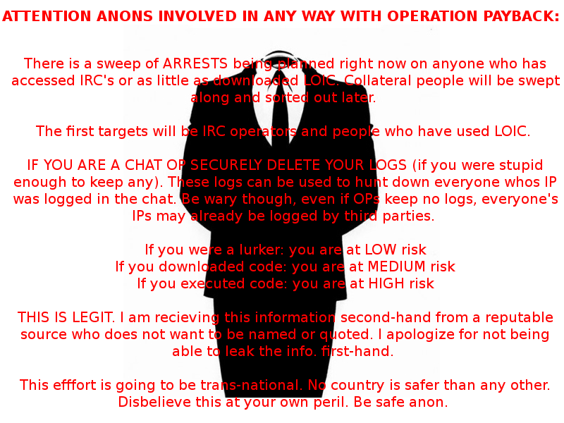 Operation: Payback is only another faction, a powerful one, that concentrates on ‘payback’ to large companies who have pushed their weight against Wikileaks. DDoS attacks are effective but largely ineffective against the companies themselves. Anonymous stated earlier today in IRC that there would be a ‘final’ target and to wait for it via twitter.