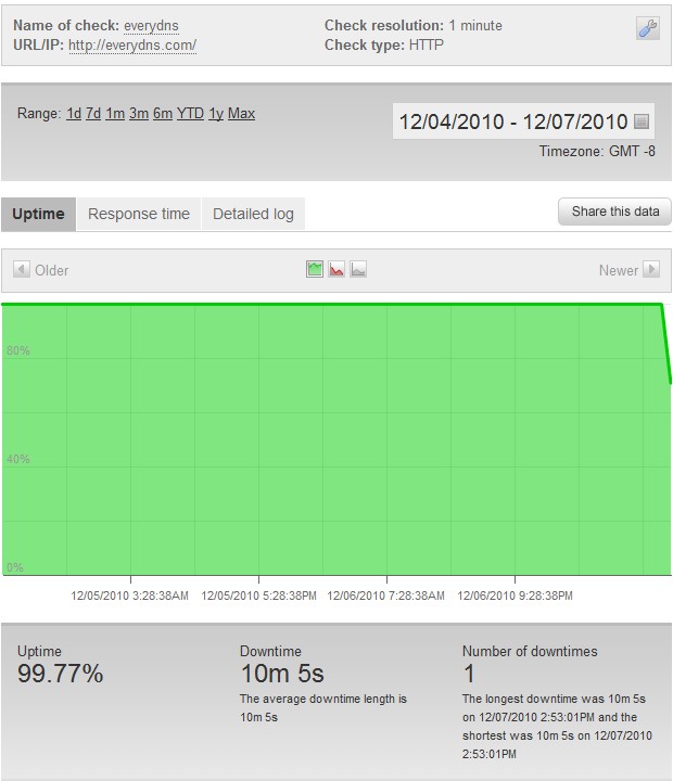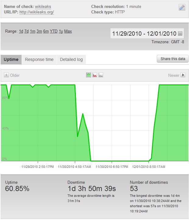The target has been switched to EveryDNS.com, the DNS provider that took WikiLeaks down. The target was announced at 2:52 PM PST and the website was taken down just one minute later at 2:53 PM PST. We have 10 minutes of recorded downtime and counting: